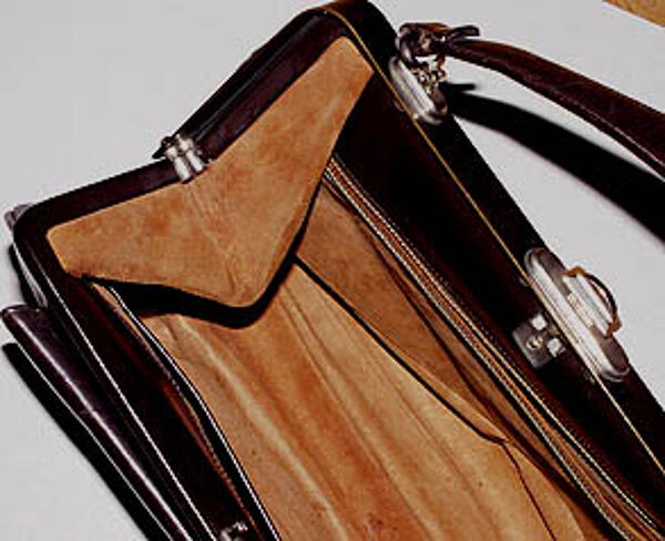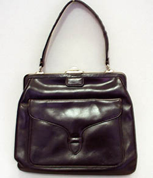 Strenge Tasche mit fast quadratischer Form; dunkelbraunes, glänzendes Leder, vorderseitig aufgesetzte Tasche. Metallbügel mit Schnappverschluß, Futter aus dunkelgelbem Wildleder, 31 x 28 cm, bis auf minimale Bereibungen des Leders und Gebrauchsspuren am Henkel guter Zustand. Vermutlich Deutschland der 30er Jahre.