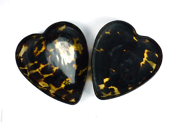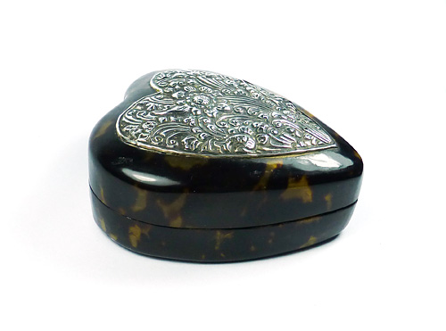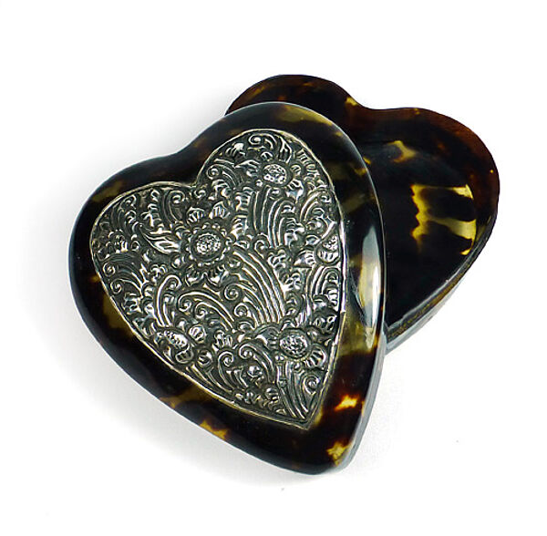 Herzförmiger Korpus aus Kunststoff mit Schildpatt-Optik. Im oberseitigen Anteil des Deckels ist ein versilbertes oder silbernes, florales Relief integriert. Maße ca. 7,5 x 6,8 cm, Höhe ca. 3,8 cm, leichte Gebrauchsspuren, Silber mit Patina. Unbezeichnet, wohl Deutschland oder Österreich der 1920er Jahre.