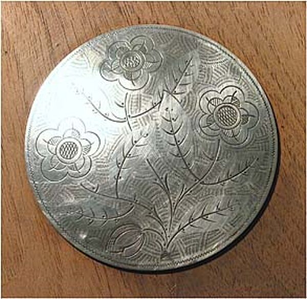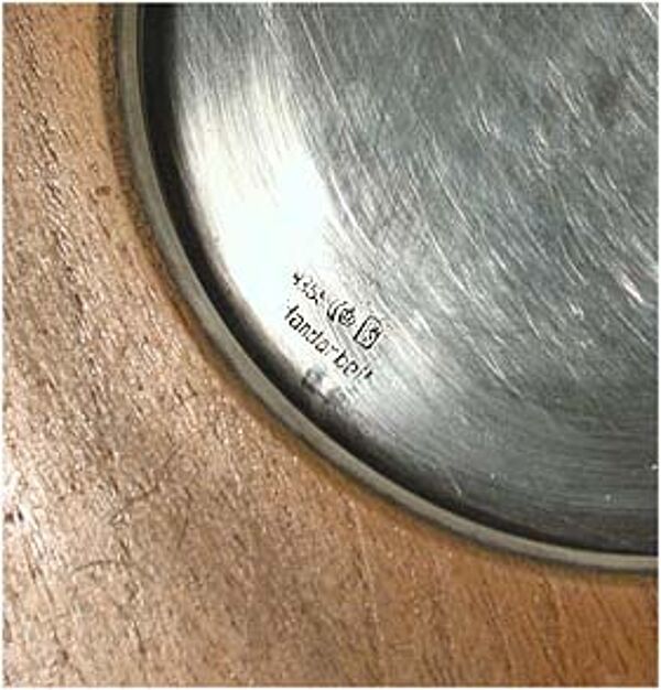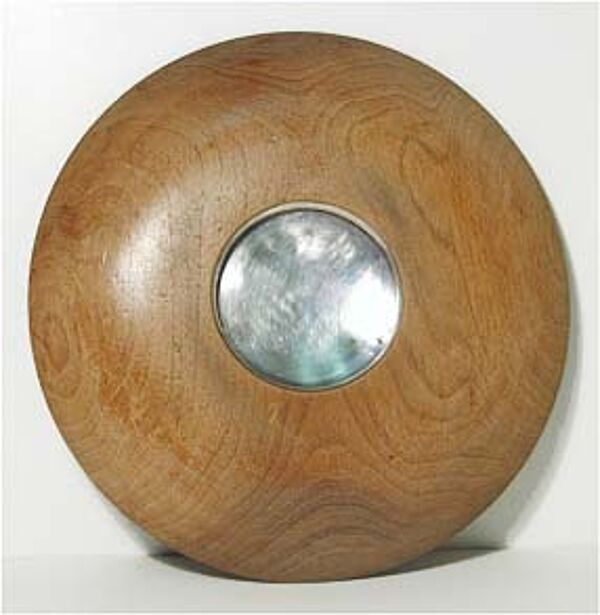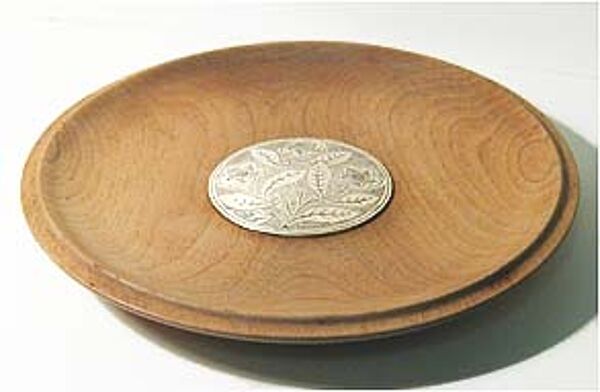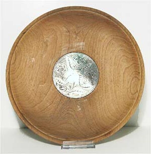 Der flach schalenförige Holzkorpus hat eine breite, im Randbereich gekehlte Fahne, im Spiegel eingelassene runde Silberplatte (835er) mit stilisiertem Blumendekor. Rückseitig kann man neben den deutschen Silberpunzen (Krone und Halbmond) ein ungedeutetes Künstler- bzw. Goldschmiede-Monogramm "KG" und die Bezeichnung "HANDARBEIT" erkennen. Außendurchmesser ca. 25,5 cm, Durchmesser der Silberscheibe ca. 8,5 cm, insgesamt moderate Gebrauchs- und Putzspuren der Holz- und Silberoberfläche. Wohl Deutschland der 20er, 30er Jahre.