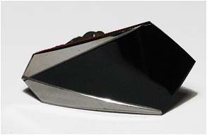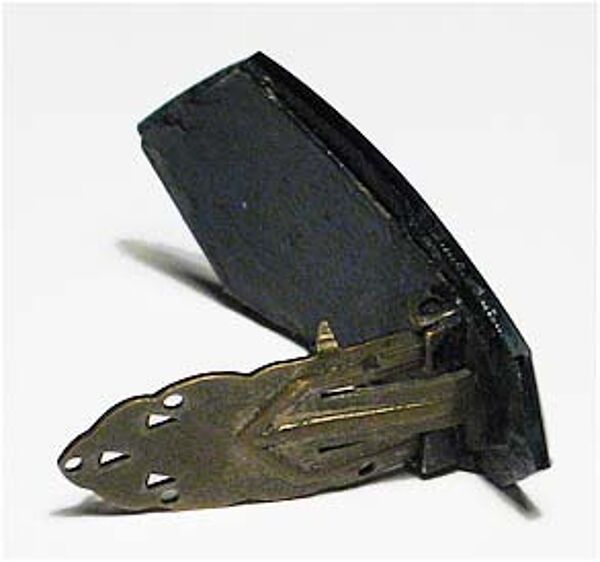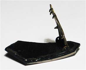 Flach konvexer, bandförmiger, sechseckig begrenzter, glänzend schwarzer Kunststoffkorpus mit teilweise silbern abhesetzten Kanten. Länge ca. 4,4 cm. Rückseitig Clip-Mechanismus, dieser mit Alterspatina. Vorderseitig kaum Gebrauchsspuren, rückseitiger Farbauftrag teilweise inhomogen bzw. berieben. Wohl Deutschland der 20er Jahre.