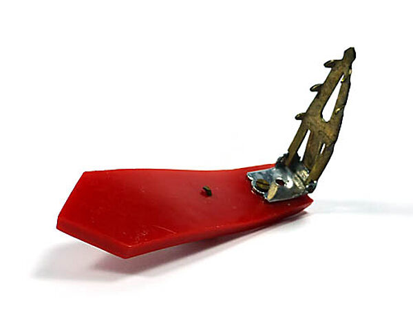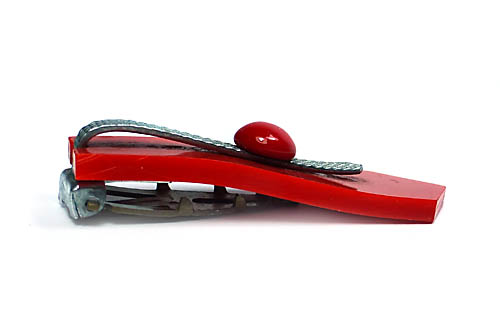 Länglicher, an einer Seite spitz zulaufender, leuchtend roter Kunststoffkorpus, der teilweise von einer verchromten Metallspange mit Waffeldekor überspannt wird, der ein rückseitig gestifteter, roter, Cabochon aufgesetzt ist. Länge ca. 5 cm, Breite ca. 1,6 cm, geringe Gebrauchsspuren. Rückseitig Klipp-Mechanismus aus Metall. Ungemarkt, wohl Deutschland der 1920er, 30er Jahre.