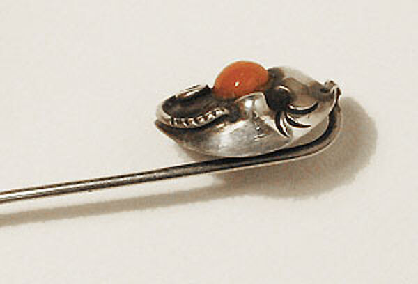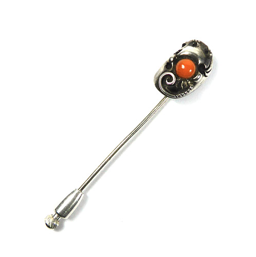 Der hohl gearbeitete Kopf aus Silber (nicht punziert aber geprüft) ist organisch-amorph gestaltet, im unteren Anteil ist ein spiralförmiges Element und zentral ein Korallencabochon aufgesetzt. Länge des Kopfes ca. 1,6 cm, Gesamtlänge der Nadel ca. 5,5 cm, ungeputzter Zustand mit partiell vorhandener Patina und geringen Gebrauchsspuren. Ungemarkt, wohl Deutschland der 1920er Jahre (evtl. Rudolf Feldmann, Bielefeld).