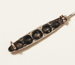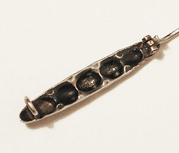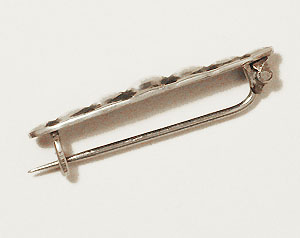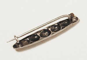 Der längliche, sich zu den abgerundeten Enden leicht verjüngende Silberkorpus (800er) weist oberseitig 7 noppenartige Auftreibungen auf. Länge ca. 3,3 cm, ungeputzter Zustand mit partieller Patina und geringen Gebrauchsspuren. Rückseitig einfache Broschierung und Markung.