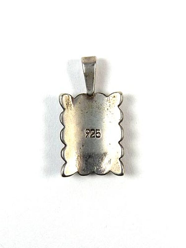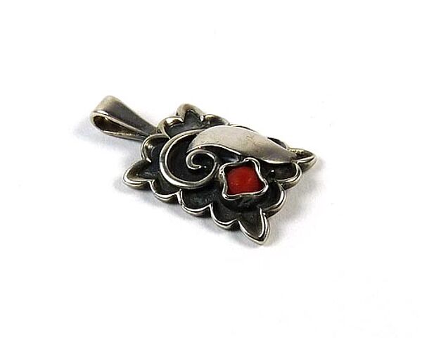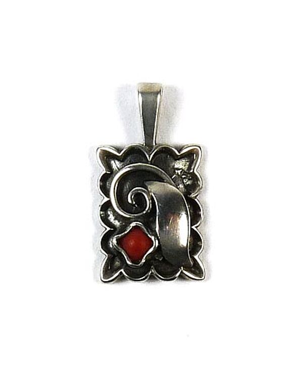 Rechteckiger Silberkorpus (925er) mit stilisierten, floralen, plastisch ausgearbeiteten Elementen. Eine in Zargenfassung integrierte Korallenperle symbolisiert eine Blüte. Entlang des Randes ist ein wellenförmig geformter Steg aufgesetzt. Oberseitig starre, längliche Öse. Länge mit Öse ca. 2,4 cm, Breite ca. 1,2 cm, ungeputzter Zustand mit partiell dunkler Patina und geringen Tragespuren. Ungemarkt, wohl Deutschland (Bielefeld?) der 1920er, 30er Jahre.