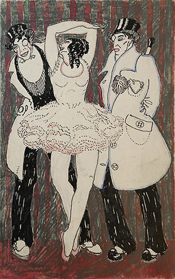 Kolorierte Federzeichnung: ohne Titel (Zwei Männer in Abendgarderobe mit Revuegirl)