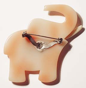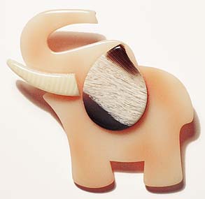 Der Kunststoff-Korpus (vermutlich Celluloid) in Form eines Elefanten ist in Beige-, Hellrosa- und Brauntönen gehalten und täuscht z.T. die Maserung von Horn vor. Höhe ca. 5,5 cm, minimale Tragespuren. Rückseitig Broschierung, ungemarkt, wohl 20er bis 40er Jahre.