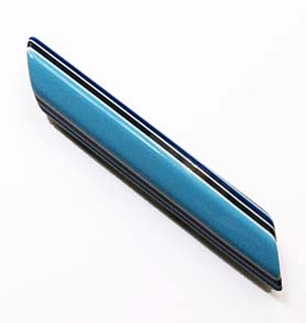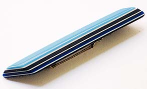 Länglicher, sich vorderseitig etwas verjüngender Korpus aus blauem Kunststoff mit Linieindekor in weiß und verschiedenen Blautönen, eine Schichtung imitierend. Länge ca. 9 cm, geringe Gebrauchsspuren. Rückseitig einfache Nadelung. Unbezeichnet, wohl Frankreich oder Belgien der 20er, 30er Jahre.