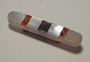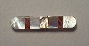 Länglicher, an den Ecken abgerundeter, durchsichtiger Kunststoffkorpus mit vorderseitig aufgelegten Perlmut- und Hornplatten (evtl. ebenfalls Kunstoff), Länge ca. 5,5 cm, insgesamt moderate Gebrauchsspuren. Ungemarkt, wohl Frankreich der 20er/30er Jahre.