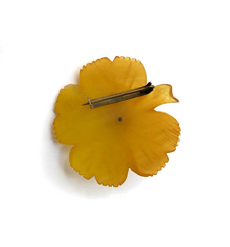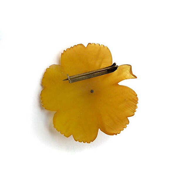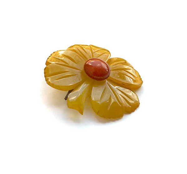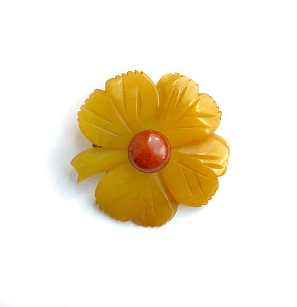 Wohl teilweise handgeschnittener Korpus aus gelben, etwas an Bernstein erinnernden Kunststoff in Form einer stilisierten Blüte. Mittig aufgesetzter, gestifteter Cabochon aus lachsfarbenem Kunststoff. Durchmesser ca. 4,4 cm, leichte Tragespuren. Rückseitig einfache Broschierung. Wohl Deutschland der 20er Jahre.