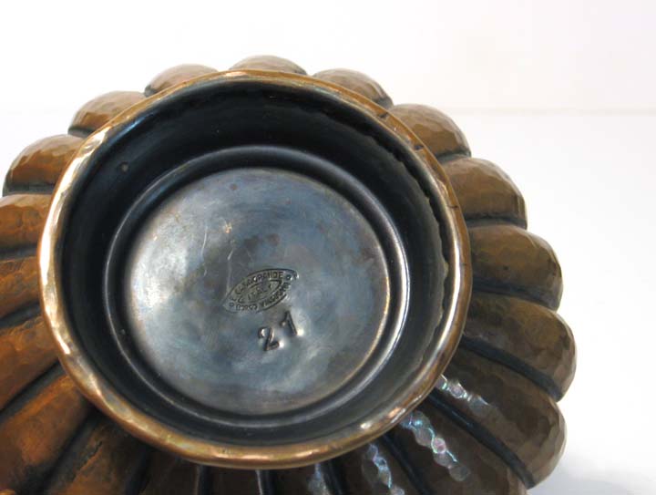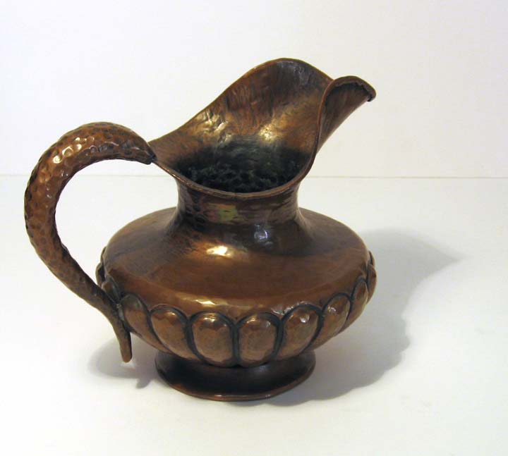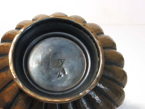 Der unterhalb des geschwungenen Mündungsrandes deutlich taillierte, in der unteren Hälfte erts fast waagerecht verlaufende und zum Fuß hin gebauchte Korpus mit angedeutet C-förmiger Handhabe aus filigran getriebenem Kupfer hat eine warme, fast gleichmäßige Patina mit nur minimalen Gebrauchsspuren. Höhe ca. 14 cm, unterseitig gemarkt : "E. Casagrande, Borgo Valsugama, Italy" sowie Modell-Nr. 21. Wohl um 1940.