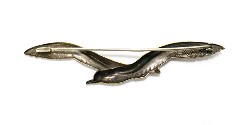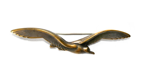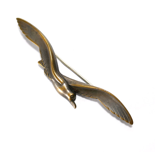 Plastischer Messing-Korpus in Form einer stilisierten, fliegenden Möwe. Länge ca. 7,8 cm, ungeputzter Zustand mit leichter Patina und geringen Tragespuren. Rückseitig einfache Broschierung, ungemarkt, wohl Deutschland der 30er, 40er Jahre.