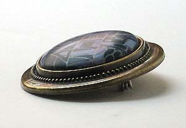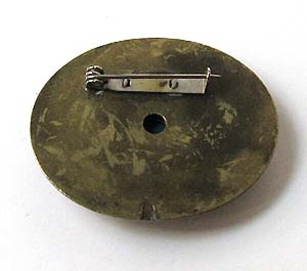 Der querovale Messingkorpus trägt einen Porzellan-Cabochon mit abstrakter, angedeutet geometrischer, polychromer Bemalung in Blau-, Violett- und Weißtönen. Die Zargenfassung hat einen Perlrand. Maße ca. 5,0 x 4,2 cm. Ungeputzter Zustand mit fast gleichmäßiger Patina und moderaten Gebrauchsspuren, die rückseitige, einfache Broschierung wurde später ergänzt. Wohl Deutschland oder Österreich der 20er Jahre.