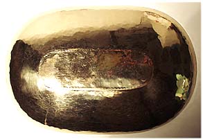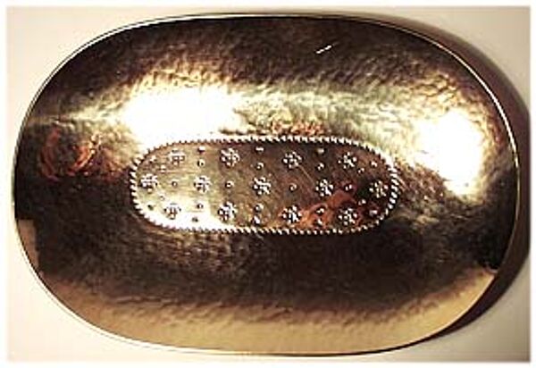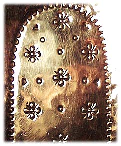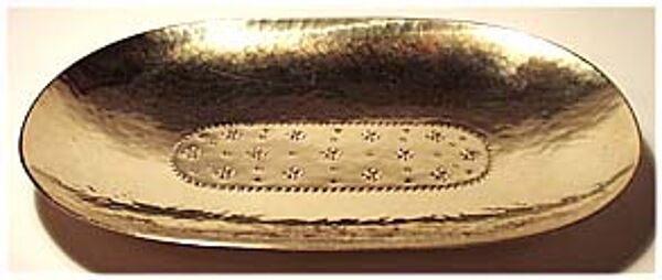 Angedeutet ovaler Korpus aus getriebenem Messingblech. Breite, flach ausgestellte Fahne, im Spiegel gepunztes Blumen- und Kreisdekor. Länge ca. 25 cm, Höhe ca 3 cm, geputzter Zustand. Unbezeichnet, wohl Deutschland der 20er, 30er Jahre.