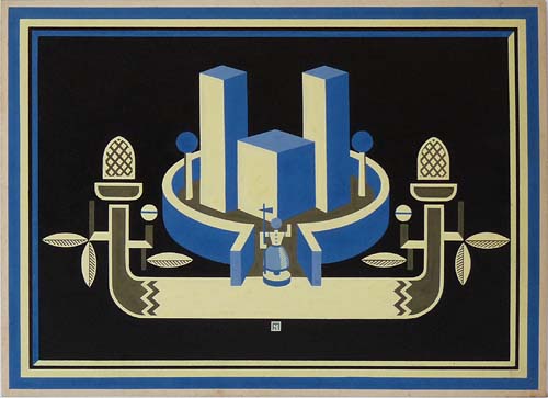 Mischtechnik (verschiedene Tuschen, evtl. auch Tempera), im unteren Bildbereich monogrammiert. Blattmasse ca. 26,5 x 19 cm, minimale Griffspuren. Wohl um 1920.