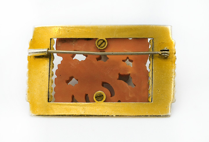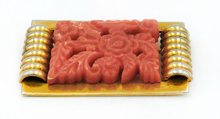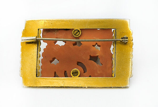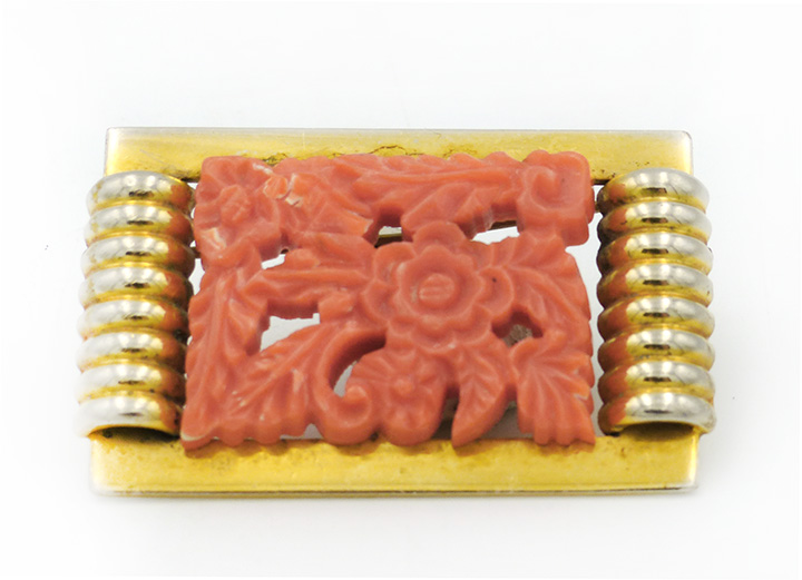 Querrechteckiger, rahmenartiger, vergoldeter Metallkorpus mit an den zwei gegenüberliegenden kurzen Stegen aufgesetzten Rollenementen. Durch zwei kleine Schrauben ist auf diesem ein lachsfarbenes, stilisiert-vegetabiles Kunststoffrelief fixiert. Maße ca. 5,2 cm x ca. 3,3 cm, leichte Patina und geringe Tragespuren. Rückseitig einfache Broschierung. Wohl Deutschland der Art-deco-Zeit (1920er, 30er Jahre).