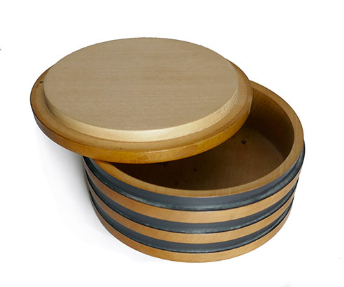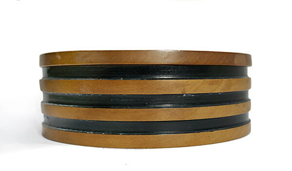 Flach-zylindrischer, hellbrauner Holzkorpus, gerillte Wandung, hier schwarz abgesetzt. Durchmesser ca. 10 cm, Höhe ca. 4 cm, geringe Altersspuren. Wohl Deutschland der 1920er Jahre.