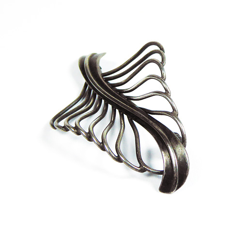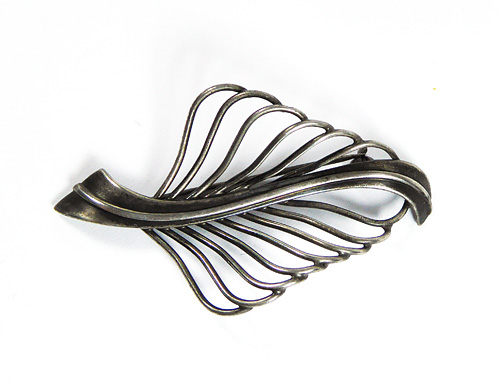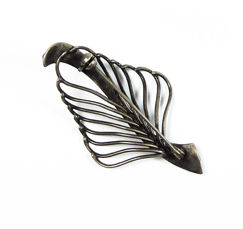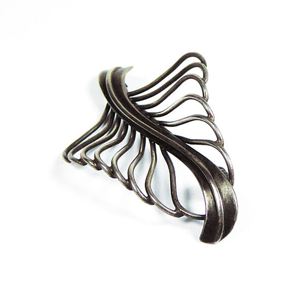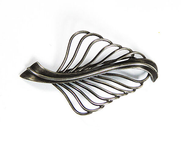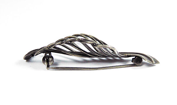 Silberner, offen gearbeiteter Korpus (800er) in Form eines stilisieren Blattes. Länge ca. 5,5 cm, Breite ca. 3 cm, ungeputzter Zustand mit fast gleichmäßiger, dunkler Patina und geringen Tragespuren. Rückseitig Sicherheitsbroschierung mit Kugelkopf. Wohl Deutschland der 1920er bis 50er Jahre.