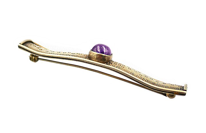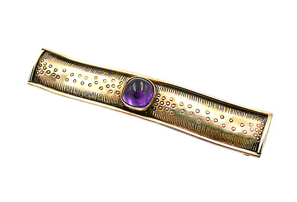 Handgearbeiteter, bandförmiger, leicht gewellter, vergoldeter Silberkorpus (935er), der mittig einen Amethystcabochon von 0,7 x 0,7 cm trägt: oberseitig ca. 6,5 x 1,1 cm, rückseitig*. Ungemarkt, wohl Deutschland der 1920er Jahren. Geringe Alters- bzw. geringe Tragespuren