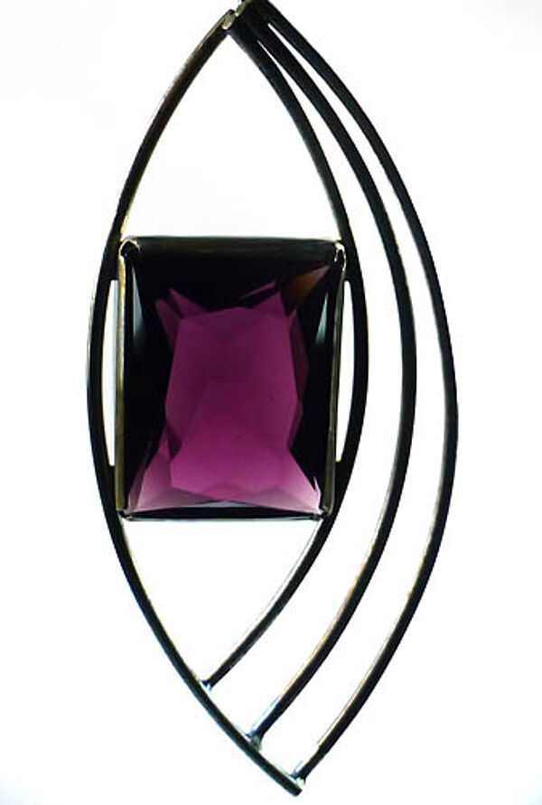 Hochovaler, neusachlich wirkender, schlichter Korpus aus filigranen Silberdrähten (800er), die einen facettiert geschliffenen Schmuckstein (Amethyst oder Spinell?) in Zargenfassung umschließen. Oberseitig starre, längliche Öse. Länge des Anhängers ca. 7,5 cm, ungeputzter Zustand mit leichter Patina und geringen Tragespuren. Ungemarkt, wohl Deutschland der 1930er bis 50er Jahre.