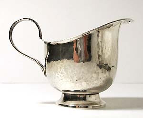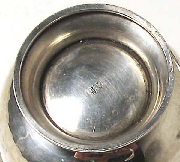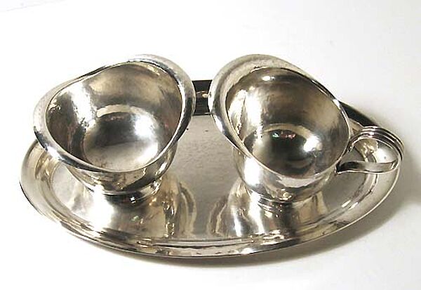 Zuckerschälchen (H. ca. 5,5 cm), Sahnekännchen (H. ca. 6,5 cm) und Tablett (L. ca. 20 cm) sind jeweils aus getriebenem Silber (800er). Zuckerschälchen und Sahnegießer haben einen hochwandigen, gefußten Korpus mit ausgestelltenr Randbereich. Geputzter Zustand mit geringen Gebrauchsspuren. Unterseitig jeweils gemarkt (zur Marke des "Weimarer Goldschmied(es) Theodor Müller, der van de Veldes Entwürfe kongenial umsetzt(e)", siehe Ulrike von Hase-Schmund "Die europäischen Zentren von 1895 bis 1915"). Wohl um 1920, also aus der Zeit, als seine beiden Söhne das Geschäft führten, siehe unten.
