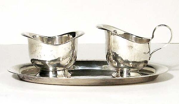Neusachliches Set aus Sahnekännchen, Zuckerschale und Tablett aus Silber