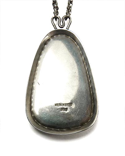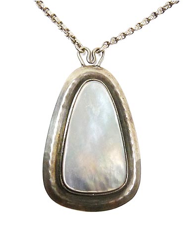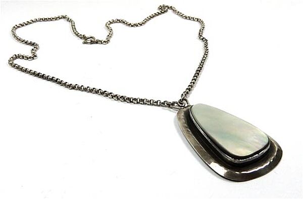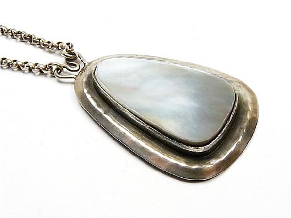 Handgefertigter, neusachlich anmutender, in der Grundform dreieckiger, silberner (800er) Anhänger, der zentral eine Perlmutt-Platte in Zargenfassung trägt. Oberseitig zweipolig gebogene Öse, an der die beiden Enden der zugehörigen, ca. 50 cm langen Silberkette fixiert sind, die einen Ringösenverschluss aufweist. Länge des Anhängers ca. 5 cm, ungeputzter Zustand mit geringen Tragespuren. Rückseitig Markung, wohl 30er bis 50er Jahre.