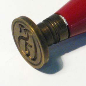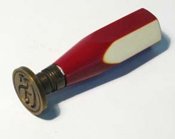 Handhabe aus rotem Kunststoff mit weißen Streifen, das Initialienfeld des Messingkopfes weist legierte, verschnörkelte Buchstaben auf. Länge ca. 7 cm, geringe Gebrauchsspuren, Messing ungeputzt. Wohl Deutschland der 20er Jahre.