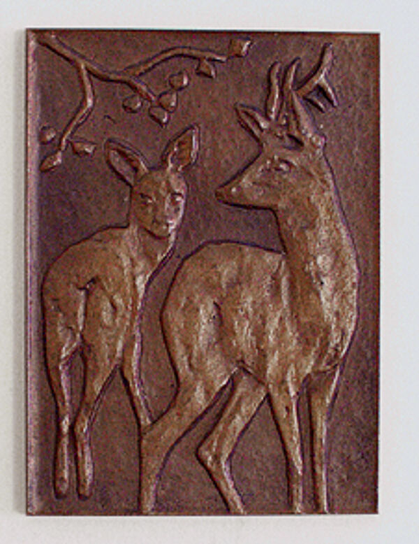 Einseitig ausgeführte Bronzeplakette, Rehmotiv, H. ca. 11cm, sehr guter Zustand, rückseitig Aufhängung und bezeichnet "Richard Niescher Krefeld", wohl 1930er.
