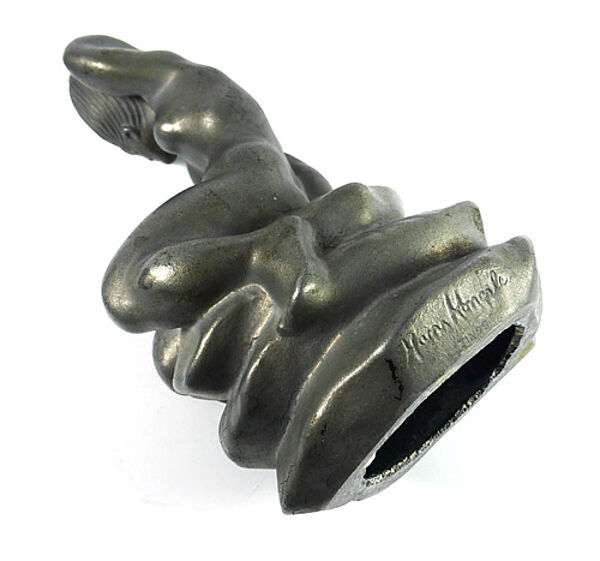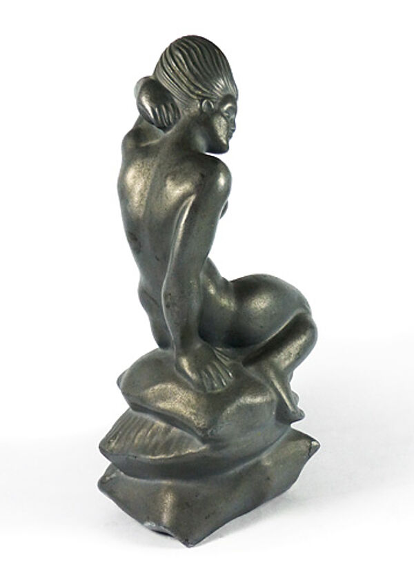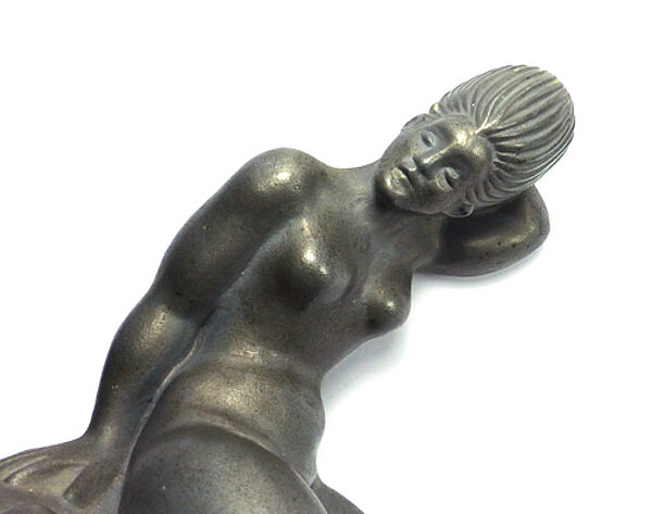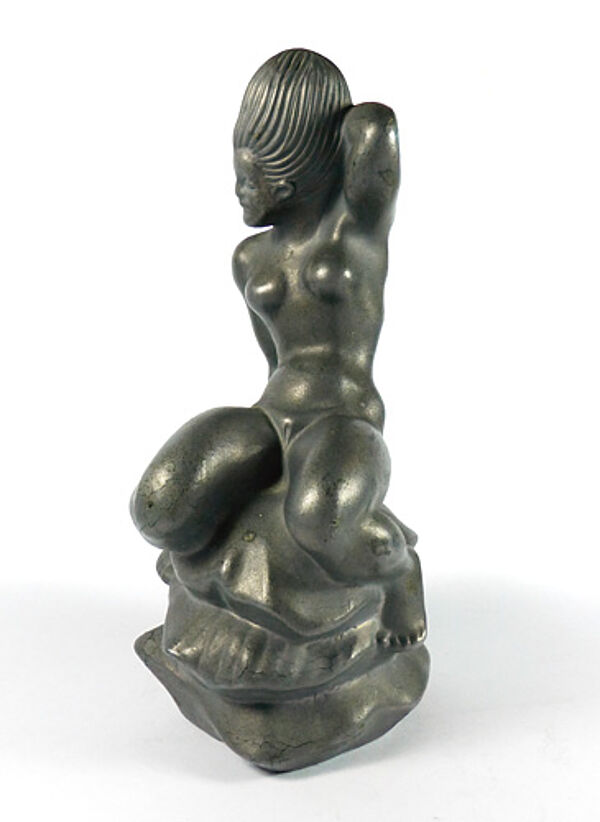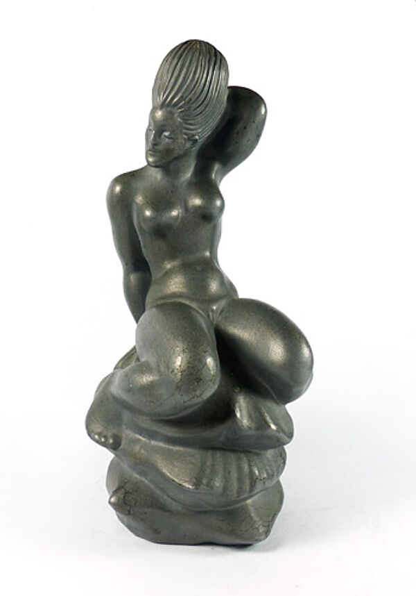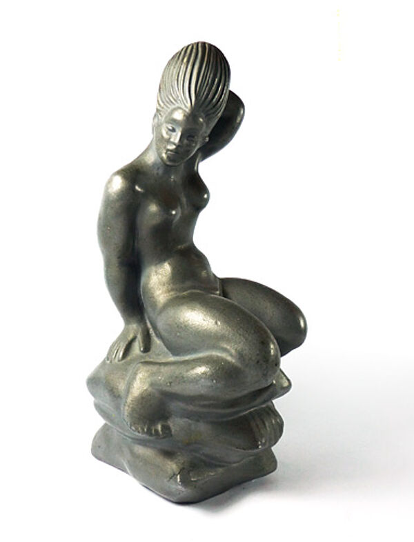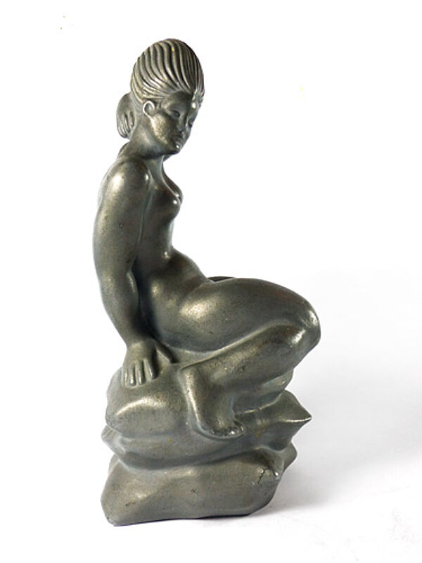 Zinn-Korpus eines leicht stilisierten, auf einen Felsen sitzenden, mit einer Hand sich rückwärts aufstützenden, mit der anderen Hand sich ins dominant modellierte Haar fassenden weiblichen Aktes. Höhe ca. 16,5 cm, moderate Patina, geringe Altersspuren. Am Socksel signiert "Hans Kongslev" (Lebensdaten unbekannt), wohl 1920er, 30er Jahre.