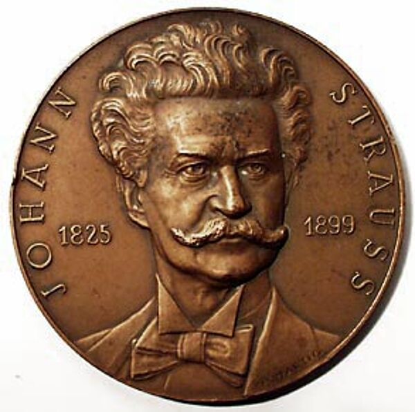 Einseitige Medaille aus Bronze. Klares Portraitrelief von schräg frontal. Schöne warme Patina, D.: ca. 7,5 cm. Bezeichnet: "Johann Strauss" sowie die Lebensdaten 1825 und 1899. Signiert A. Hartig. Die Medaille dürfte zum 100. Geburtstag, also 1925 herausgegeben wurden sein.