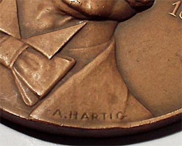 Zitat aus Wikipedia: Arnold Hartig (* 12. August 1878 in Brand bei Tannwald/Nordböhmen; † 2. Februar 1972 in Purkersdorf bei Wien) war ein sudetendeutscher Bildhauer und Medailleur. Er arbeitete sechs Jahrzehnte als Medailleur in Wien. Er war Schüler von Rudolf Zitte und studierte an der Wiener Kunstgewerbeschule bei Stefan Schwartz. Sein Frühwerk 1903/1904 war am Jugendstil orientiert. Im Ersten Weltkrieg entwarf er Kriegsmedaillen. In der schwierigen Nachkriegszeit fertigte er im eigenen Atelier Porträts für Industrielle. Er arbeitete mit dem Wiener Hauptmünzamt zusammen und schuf zahlreiche Schillingmünzen. Berühmt wurden seine Komponistenporträts von Mozart, Haydn, Beethoven und Schubert. In den 1930er Jahren wandte er sich der religiösen Medaille zu. Nach 1945 schuf er Medaillen auf Exponenten der Heimatvertriebenen aus der Tschechoslowakei. Zu seinem Spätwerk gehören Medaillen auf Papst Pius XII., welche weite Verbreitung fanden. Insgesamt schuf er etwa 600 Werke. Seinen künstlerischen Nachlass von etwa 400 Werken übergab er 1965 dem Museum Lauriacum in Enns.