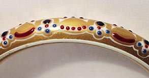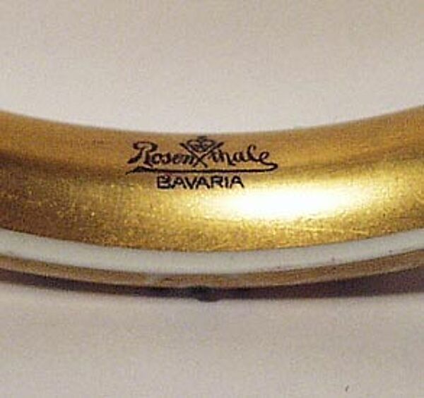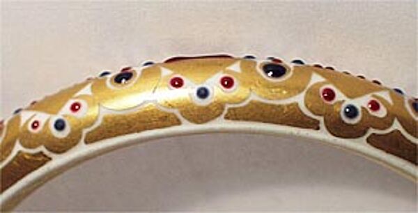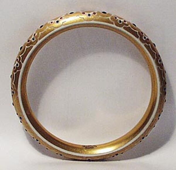 Korpus aus weißem Porzellan, polychrome erhabene Aufglasurbemalung auf Golddekor, innenseitig homogen vergoldet, hier gemarkt. Innendurchmesser ca. 7,2 cm, Außendurchmesser ca. 9,1 cm. Geringe Tragespuren. Wohl um 1925.