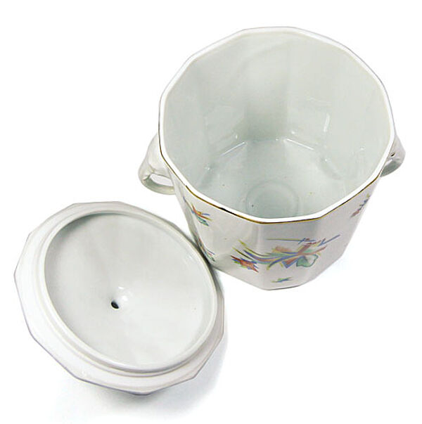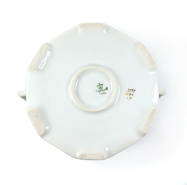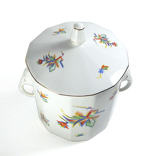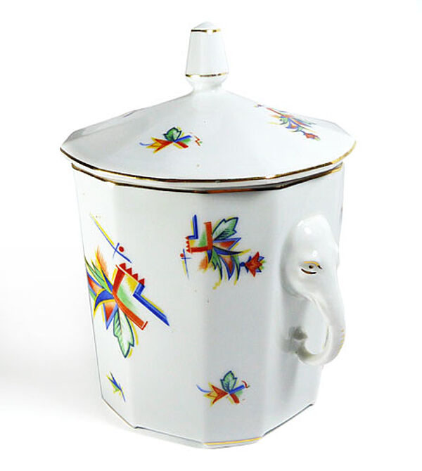 Annähernd zylindrischer, streng genommen aber zwölfeckiger Porzellankorpus auf 6 flachen, stegartigen Beinen. Seitlich befinden sich gegenüberliegend je eine vollplastische Handhabe in Form eines Elefantenkopfes. Flach kegelförmiger Deckel, der die 12-eckige Form des Unterteils aufnimmt. Schmaler, länglicher, kapselartiger Deckelgriff. Polychromes abstrakt-florales Zackendekor in typischer Art deco-Ästhetik. Höhe ca. 16,5 cm, geringe Gebrauchsspuren. Unterseitig Markung, wohl 1920er Jahre.