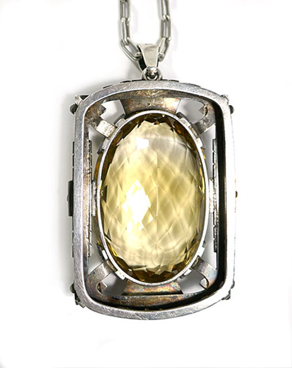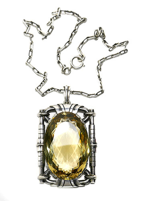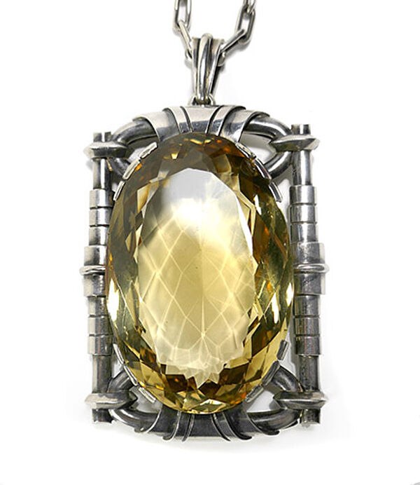 Offen handgearbeiteter Silberanhänger (900er), der durch einen facettiert geschliffenen, hellgelben, transparenten Schmuckstein (evtl. synthetischer Citrin??) dominiert wird, dieser ist durch ein Geviert aus umwickelten Silberstangen umrahmt, eingefasst durch zurückgenommene kleine Krappen. Oberseitig bewegliche Öse. Hierzu originale, handgefertigte Ankerkette mit Federringöse. Anhängermaße ca. 7 x 5 cm, Länge mit Öse ca.8 cm, Kettenlänge ca. 52 cm Zustand mit leichter Patina und geringen Tragespuren. Ungemarkt, wohl Deutschland der 1920er, 30er Jahre. Evtl. Meisterstück?
