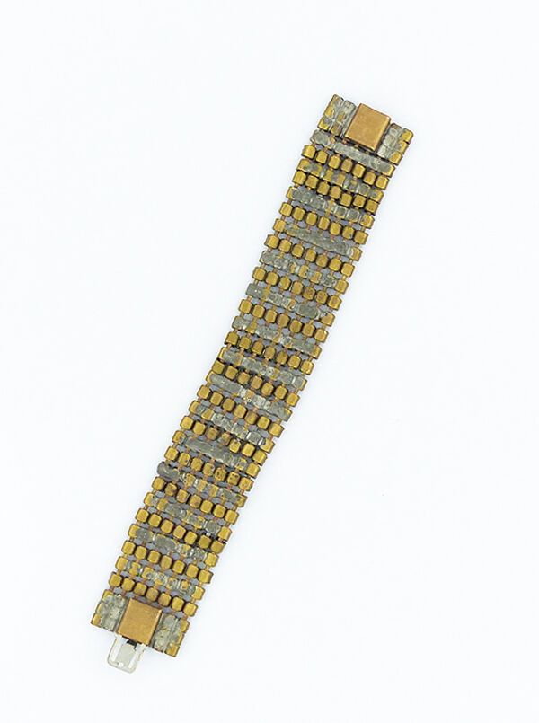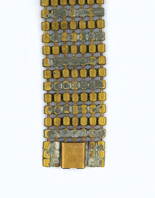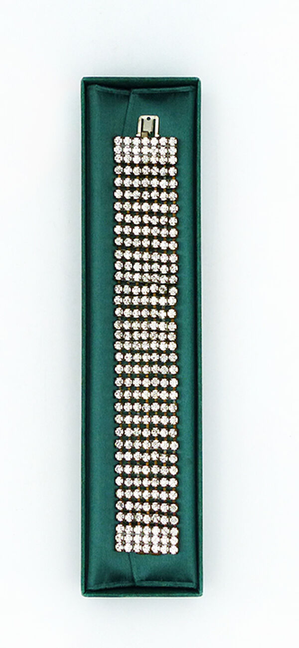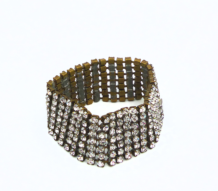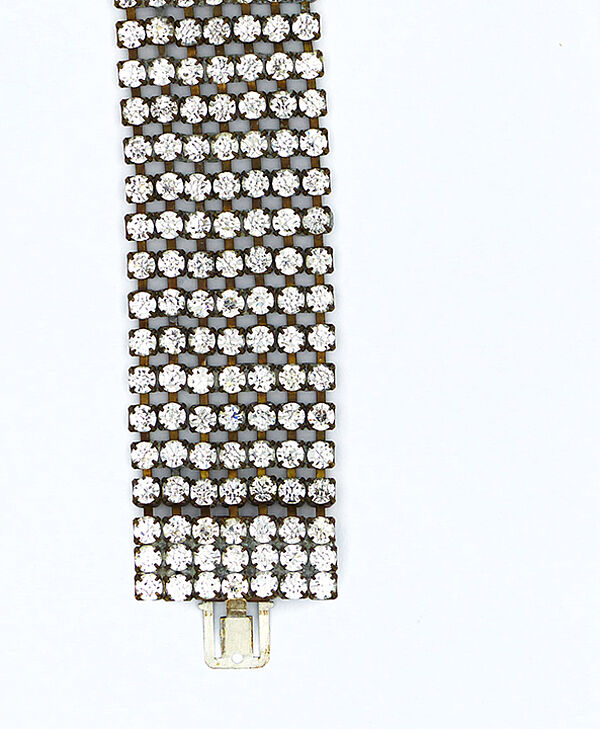 Breites, überwiegend bewegliches (nur unmittelbar an den beiden Randbereichen starres) Metall-Armband (Messing oder Tomback und Weißmetall?), welches oberseitig 7-reihig mit Strass-Steinen besetzt ist. Federzungenverschluss. Länge ca.17,5 cm, geringe Altersspuren, das Metall wirkt innenseitig etwas berieben. Wohl Deutschland der 1920er Jahre.