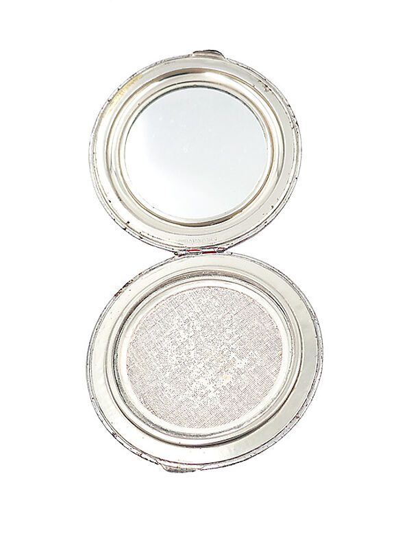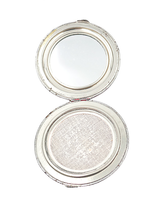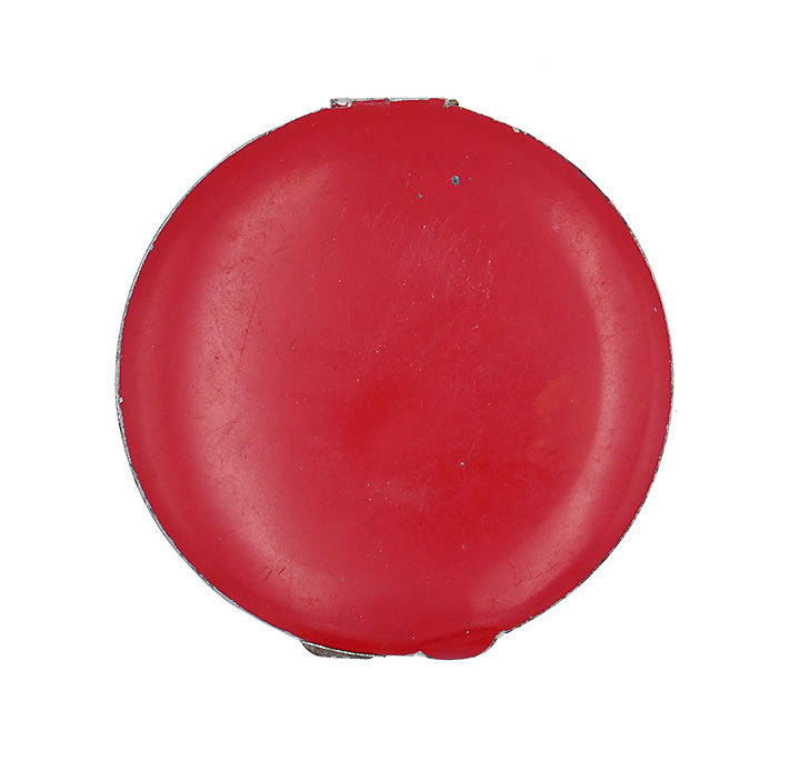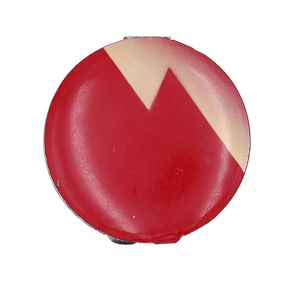 Flach diskusartiger, scharnierter Dosenkorpus mit einer Lackschicht überzogenem Metall. Oberseitig abstraktes (schabloniertes) Dekor in Rot und Beige/Rosa, unterseitig monochrom rot. Innenseitig befindet sich im Deckel ein Spiegel, unterseitig ein herausnehmbares Gazenetz im Metallrahmen für den Puder (mit leichten Puderrückständen), zudem runde, lose Stoffabdeckung. Klippverschluss mit zwei flachen, vom Rand ausgehenden Handhaben. Durchmesser ca. 8,5 cm, leichte Patina, geringe Alters- und Gebrauchsspuren. Innenseitig gemarkt "TCHECHOSLOVAQUIE" (also war die Dose vermutlich für den französischen oder belgischen Markt bestimmt gewesen), wohl 1920er, 30er Jahre.