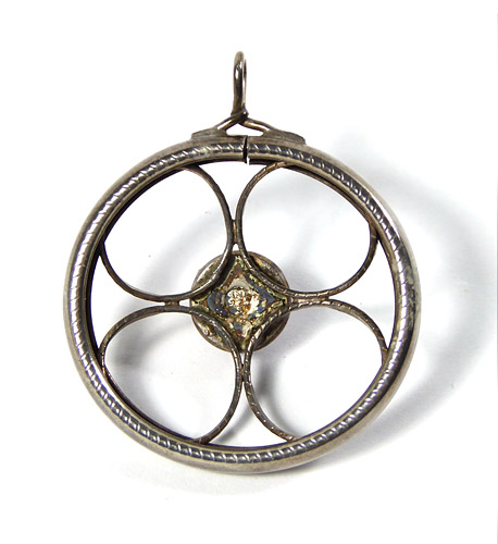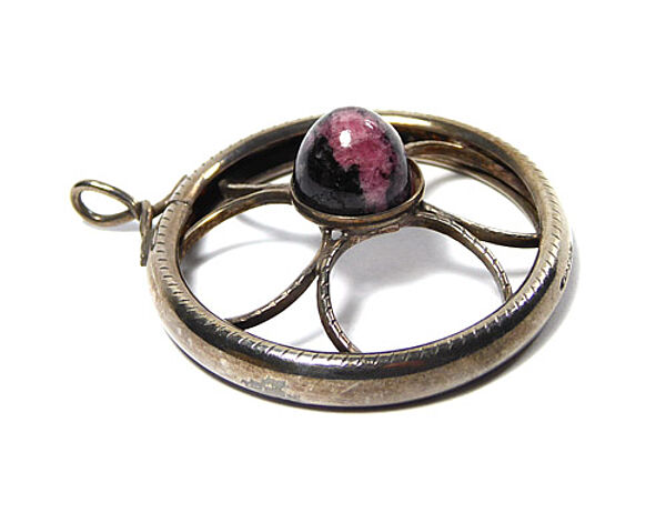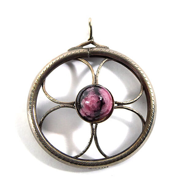 Offen gearbeiteter, radartiger Silberkorpus (925er), ausgefüllt mit bogenartigen, feinen Elementen, die mittig zu einer Scheibe zusammenlaufen, auf der ein kegelförmiger Rhodochrosit-Cabochon in Zargenfassung fixiert ist. Oberseitig aufgelöteter Draht, der zu einer rechtwinklig ausgerichteten, starren Öse gedreht ist. Durchmesser ca. 3,8 cm, ungeputzter Zustand mit leichter Patina und geringen Tragespuren. Rückseitig gemarkt ("N", ungedeutet). Wohl Deutschland oder Skandinavien der 1930er bis 50er Jahre.