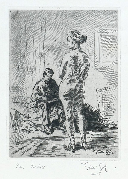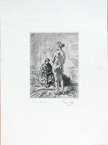 Radierung auf kräftigem Papier, rechts unter der Darstellung mit Bleistift handsigniert, links betitelt, rechts unten in der Platte nochmals signiert sowie datiert "1920". Bildmaße ca. 16 x 12 cm, Blattmaße ca. 33,5 x 25,2 cm, geringe Alters-, Griff- Lagerspuren.