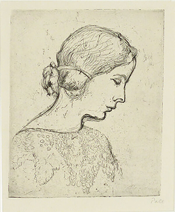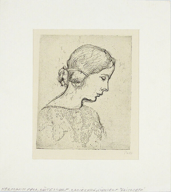 Radierung auf leicht chamoistonigem Bütten. Sensibles, sanftes Damenbildnis mit gesenktem Blick im Profil nach rechts. Unterhalb der Darstellung rechts mit Bleistift handsigniert. Aus: Die Schaffenden, VIII. Jg. 1. Mappe, Berlin (Euphorion Verlag) 1932, 1 von 100 Exemplaren auf Bütten. Darstellungsmaße ca. 24,5 x 20 cm, Außenmaße des neuzeitlichen Passepartouts ca. 42 x 36,5 cm. Minimale Alters-, Griff- und Lagerspuren.