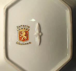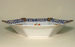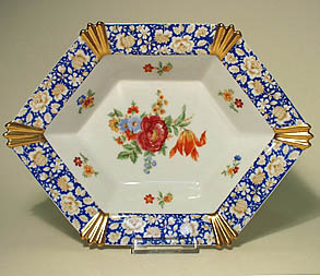 6 eckige, längliche Form. phantasievolle Randgestaltung. Blumendekor. teilweise vergoldet. L. 27 cm. 5 mm kleiner Abschlag an einer Kantenunterseite. gemarkt Schumann, Bavaria. 40er Jahre.