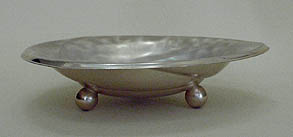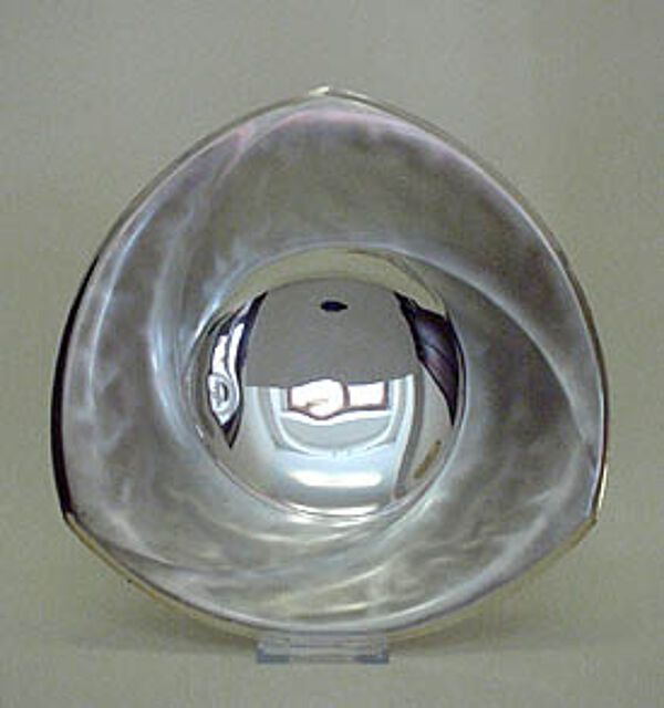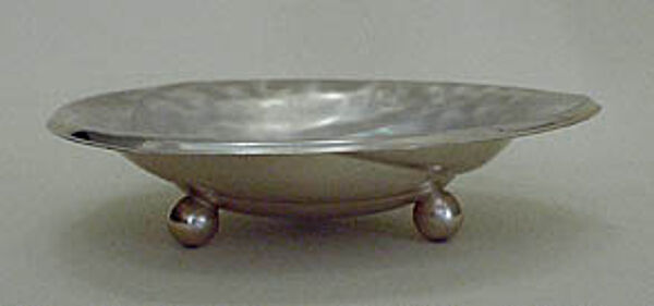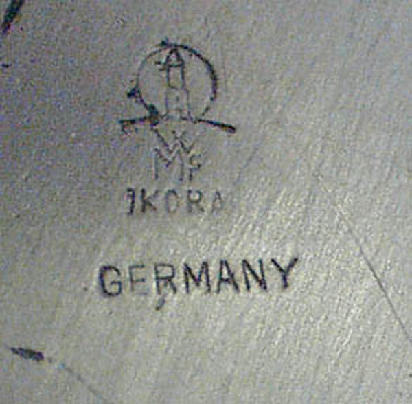versilbert, dreieckig, bogenförmige Seiten, auf drei Kugelfüßen stehend, geringe Delle Schaleninnenseite, diskrete Gebrauchsspuren, D. 27,3 cm, gemarkt "WMF Ikora Germany", 1930er-50er