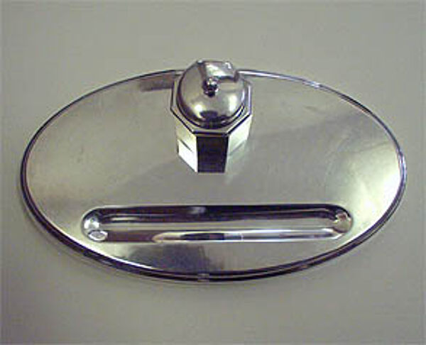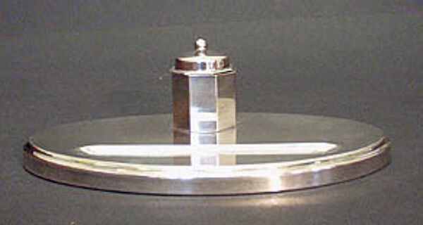 Korpus aus Neusilber, bestehend aus einer ovalen Grundplatte mit eingelassener Federhalterablage sowie montiertem Tintenfaß. Dieses mit Deckel u. Glaseinsatz, H. ca. 7,5cm, L. 24 cm, bezeichnet IMPORT Ia N.S., wohl 20er Jahre.
