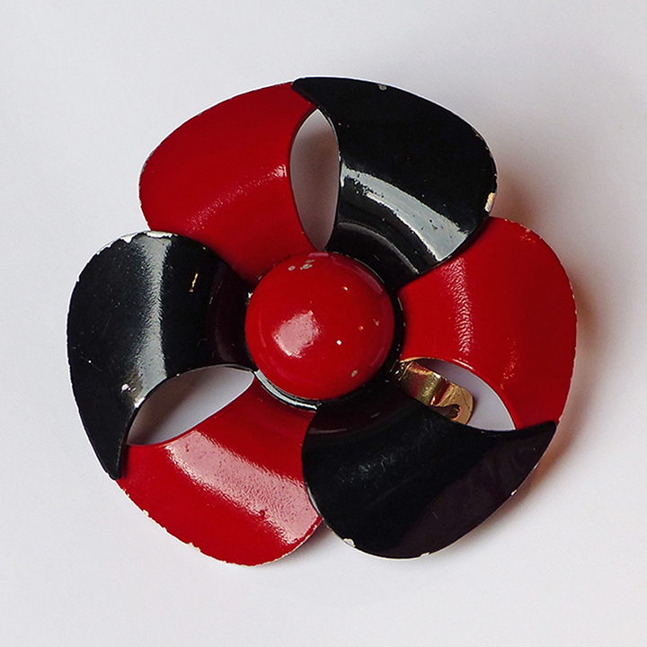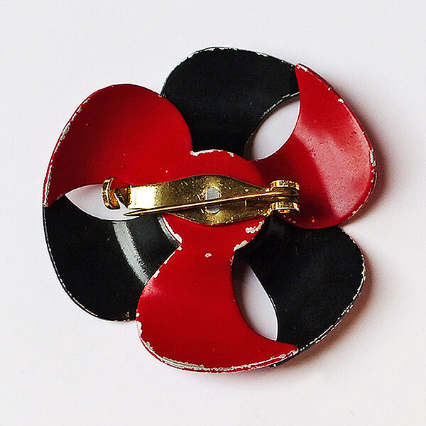 Plastisch angelegter Weißmetallkorpus in Form einer stilisierten Blüte, deren 6 Blütenblätter abwechselnd leuchtend rot und schwarz gefasst sind. Durchmesser ca. 4,5 cm, geringe Tragespuren, so zeigen sich winzige Stellen mit Farbverlust, siehe Fotos. Rückseitig einfache Messing-Broschierung, Modeschmuck wohl der 1920er bis 40er Jahre.