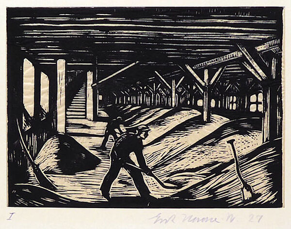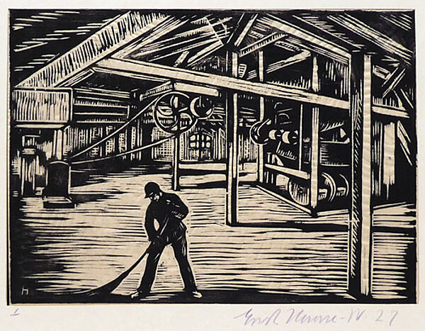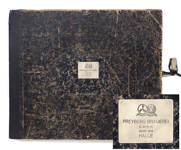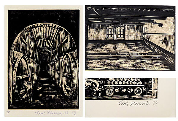 16 gemäßigt expressive Holzschnitte: dargestellt sind Brauerei-Arbeiter bei ihren Tätigkeiten und die Brauerei-Räumlichkeiten, aber auch Maschinen und Antriebswellen. Die Blätter sind jeweils im Passepartout, hier rechts unten mit Bleistift handsigniert "Ernst Haase-W." (die Lebensdaten des Künstlers sind uns leider nicht bekannt), datiert (19)"27" und links unten wohl auflagenbezeichnet, jeweils "I". Im Stock sind die Arbeiten zudem mit "H" monogrammiert. Bildmaße ca. 22 x 16 cm, Passepartoutmaße ca. 38,5 x 32 cm, geringe Alters-, Griff- und Lagerspuren. Die Holzschnitte befinden sich in einer alten und wohl auch originalen Mappe aus der Zeit. Sie trägt vorderseitig einen kleine Aufkleber: "Freyberg Brauerei - G.M.B.H. - GEGR: 1815 - HALLE" und weist deutlichere Altersspuren auf.