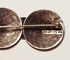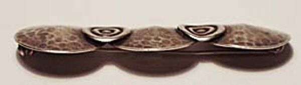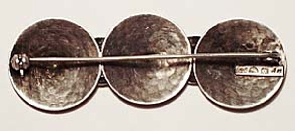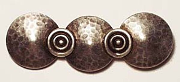 Drei konvex gewölbte Scheiben aus getriebenem Silber (925er) bilden den Korpus. An den Verbindungsstellen sind zwei kleinere, leicht konkave Scheiben mit Spiraldekor aufgesetzt. Rückseitig Sicherheitsverschluß mit Kugelkopf sowie mehrere ungedeutete Markungen. Länge ca. 6 cm, ungeputzter Zustand mit Patina und moderaten Gebrauchsspuren. Wohl Deutschland der 20er Jahre.