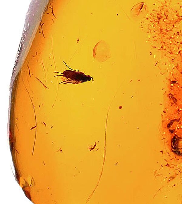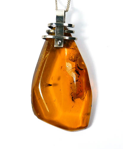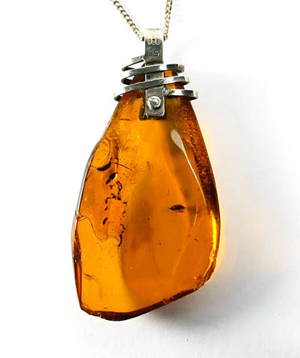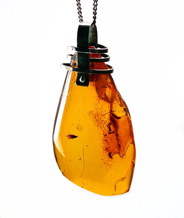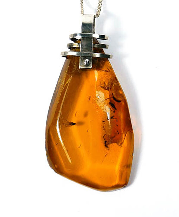 Der annähernd tropfenförmige, gemuggelte, orange-braune, luzide Bernstein mit Insekteneinschluss wird oberseitig durch aufwendige Silberaufhängung (835er) bekrönt, die ein spiralförmiges Element integriert. Hier gemarkt mit "S" (ungedeutet, evtl. Otto Stüber / Hamburg?). Maße Aufhängung ca. 5,5 x 3 cm. Geringe Altersspuren, so zeigen sich im unteren Bereich zwei kleine, kaum sichtbare Abschläge. Wohl Deutschland der 1920er, 30er Jahre.