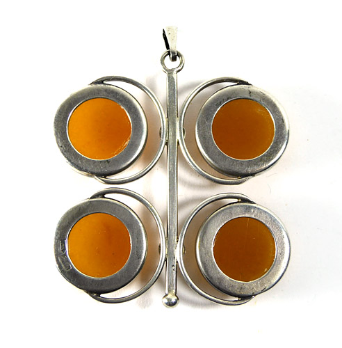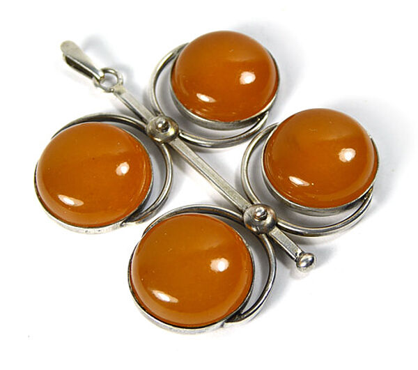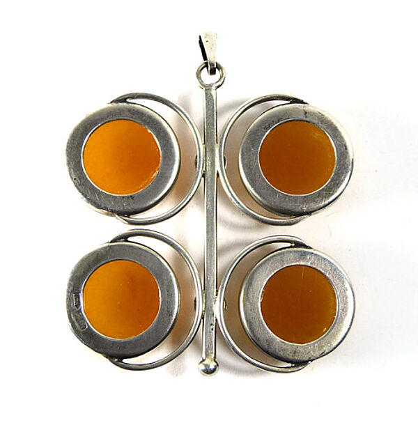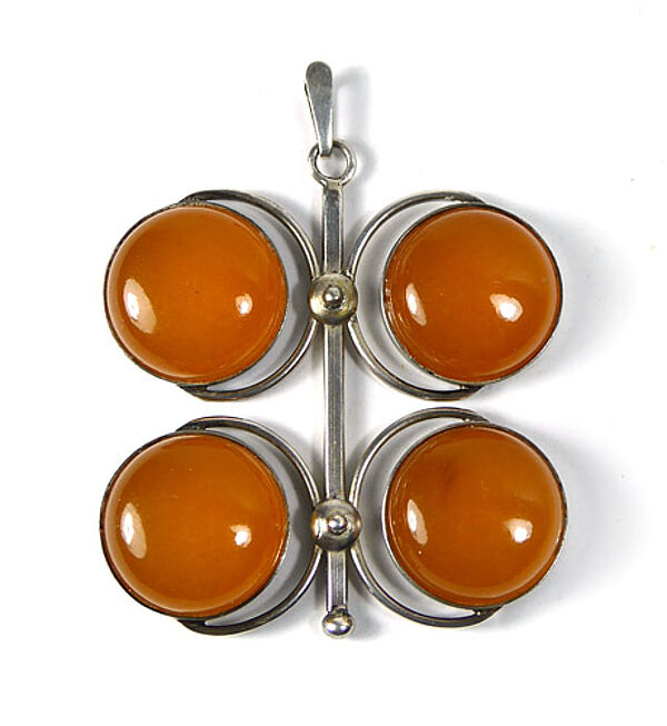 Silberner Korpus (875er) in Form eines abstrahierten Schmetterlings, wobei von einem zentralen, senkrechten Steg, an dessen oberen Ende sich eine bewegliche Öse befindet, beidseits je zwei sichelförmige Halterungen einen opaken, orange-braunen Bernstein-Cabochon tragen. Maße ca. 5,7 (mit Öse) x 4,6 cm, Durchmesser der Bernsteine ca. 1,7 cm. Ungeputzter Zustand mit minimaler Patina und diskreten Tragespuren. Rückseitig gemarkt mit Sowjetstern und "P" sowie ungedeutete Markung. Wohl 1920er, 30er Jahre.