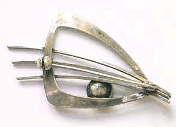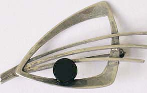 Der offen gearbeitete, in der Grundform einem ungleichschenkligen Dreieck (mit leicht konvexen Seitenkanten) gleichende Silberkorpus (925er) weist asymmetrisch eine runde, zargengefaßte Onyx-Platte und aufgesetzte Streifenelemente auf. Rückseitig Sicherheitsbroschierung mit Kugelkopf. Ungeputzter Zustand mit geringen Gebrauchsspuren. Breite ca. 5 cm. Ungemarkt, wohl Deutschland der 30er bis 50er Jahre.