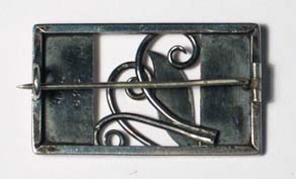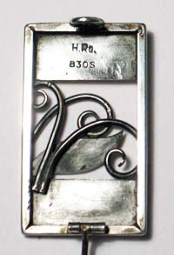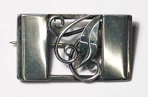 Rechteckiger, zentral offen gearbeiteter Silberkorpus: zwei seitliche Silberbänder flankieren ein zentrales, plastisch ausgearbeitetes, stilisiertes Blattelement. Maße ca. 4 cm x 2,3 cm, geringe Gebrauchsspuren, ungeputzter Zustand. Rückseitig einfache Broschierung und Markung (H.Ro. = wohl Henry Roland / Aarhus, dann Ausführung vermutlich zwischen 1963 und 73, wobei die Brosche stilistisch älter wirkt).
