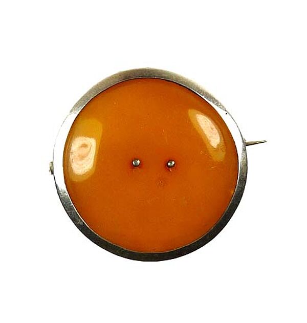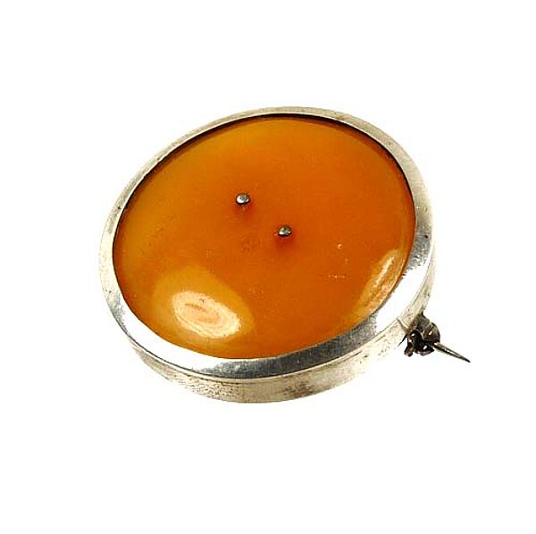 Der Korpus besteht aus einem scheibenförmig gemugelten, honigfarbenen, opaken Bernstein, der von einer breiten Silberzarge (geprüft) eingefasst wird. Mittig sind zwei kleine Silberstifte eingelassen, die das knopfartige Aussehen der Brosche bedingen. Durchmesser ca. 3,8 cm, ungeputzter Zustand mit moderaten Tragespuren, so finden sich minimale, quasi nicht sichtbare Fehlstellen des Bernsteins im Bereich der Silberstifte und rückseitig ein flacher Abschlag. Rückseitig Sicherheitsbroschierung mit Kugelkopf. Ungemarkt, vermutlich Königsberg der 20er, 30er Jahre.